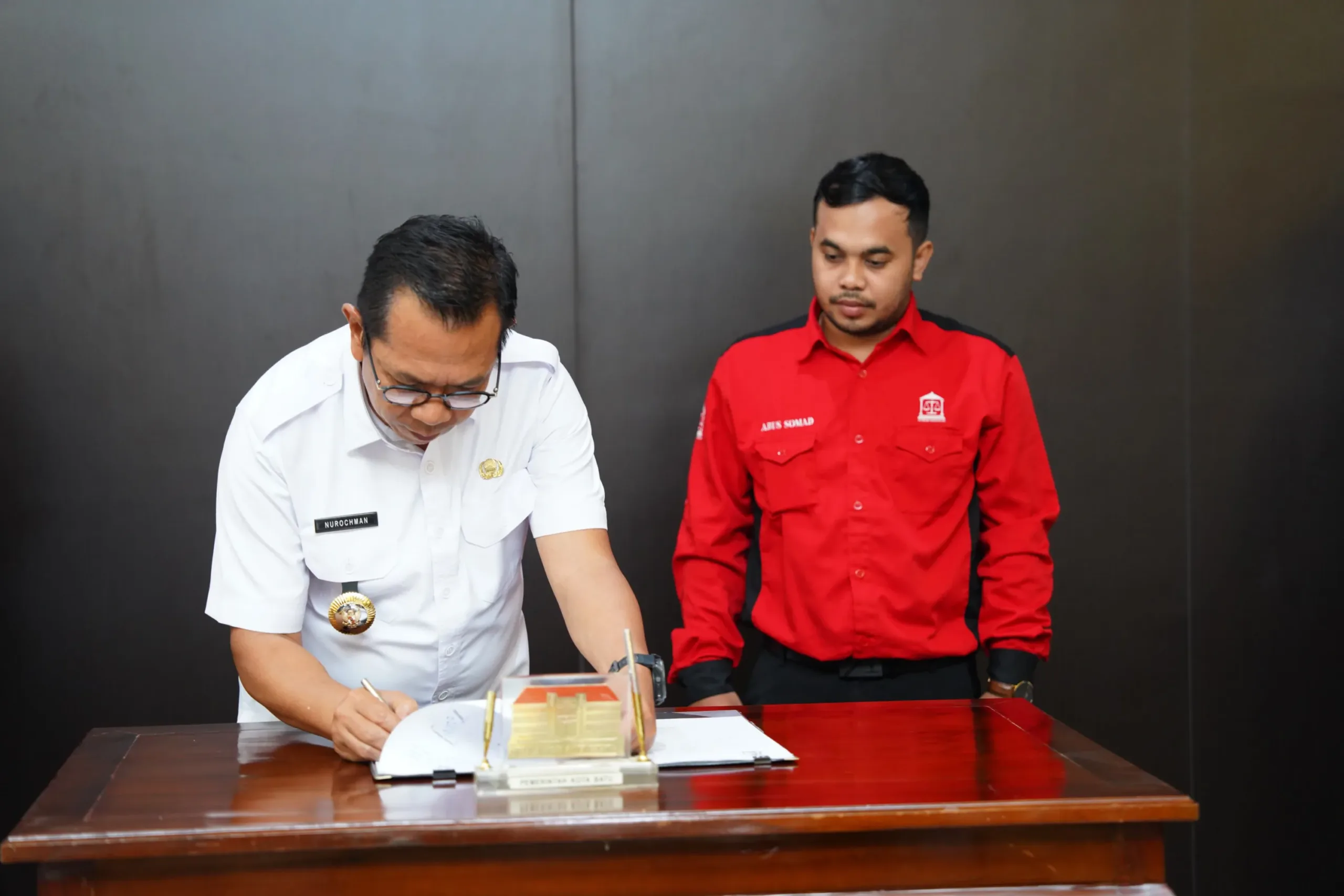BATU (IDEA JATIM) – Wali Kota Batu, Nurochman (Cak Nur), dan Wakil Wali Kota Batu, Heli Suyanto (Mas Heli), melakukan penandatanganan kesepakatan dengan Lembaga Bantuan Hukum (LBH) Terakreditasi di Rupatama, Balai Kota Amomg Tani, Rabu (25/6/2025). Penandatanganan ini merupakan janji politik mereka dalam pendampingan hukum bagi warga pra sejahtera di Kota Batu.