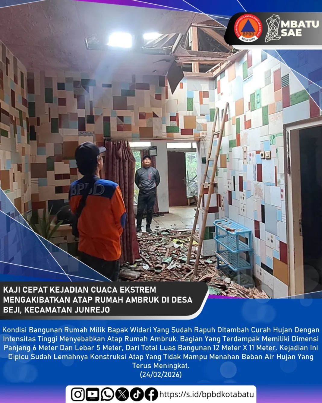 “Kondisi konstruksi atap rumah memang sudah cukup rapuh. Begitu hujan dengan intensitas tinggi turun dalam durasi yang lama, beban air tidak lagi mampu ditahan oleh struktur bangunan sehingga ambruk,” ujar Suwoko saat dikonfirmasi, Selasa (24/2).