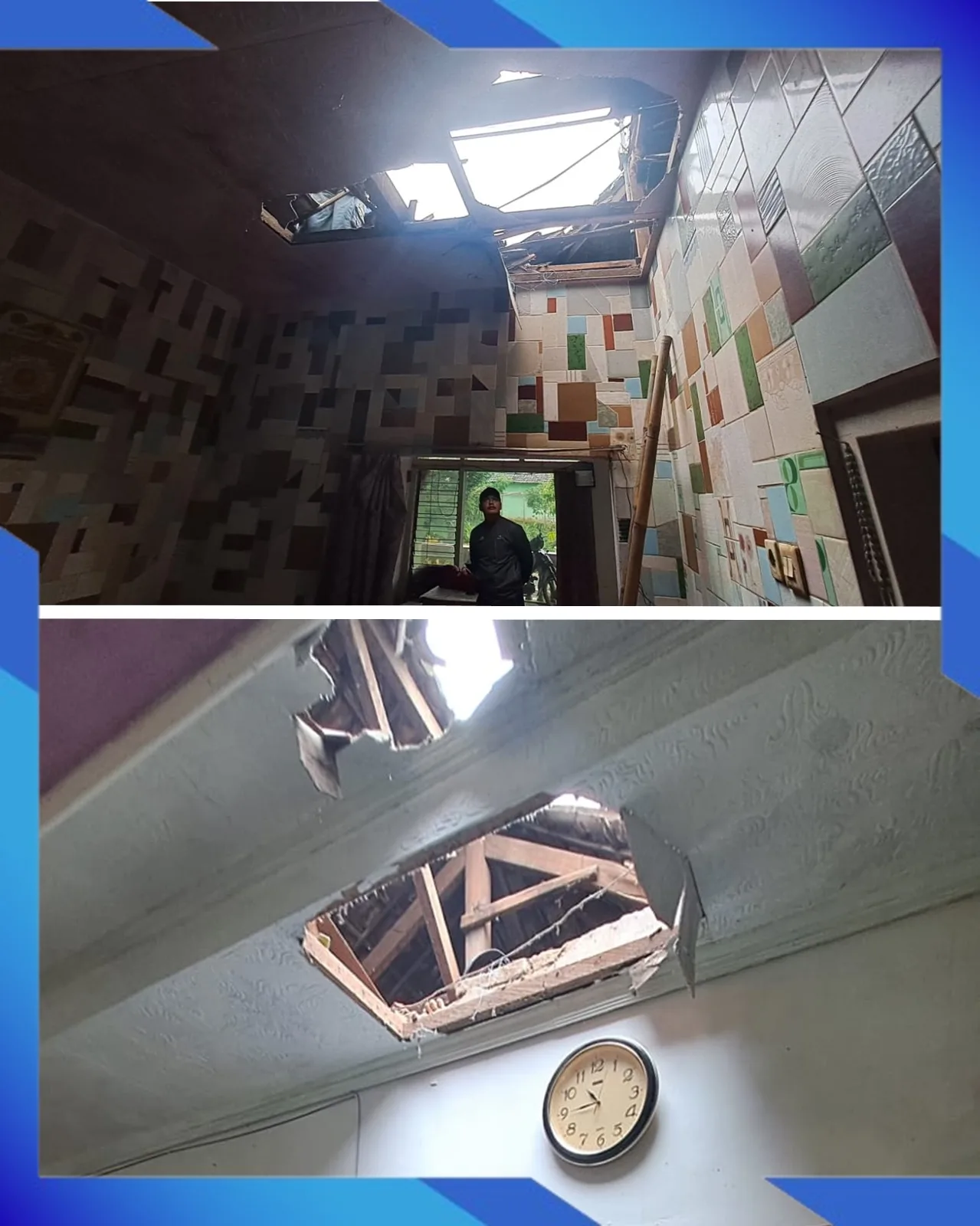 Area Terdampak: Material atap menimpa ruang tamu dan ruang tengah, sehingga mengganggu aktivitas harian penghuni rumah.