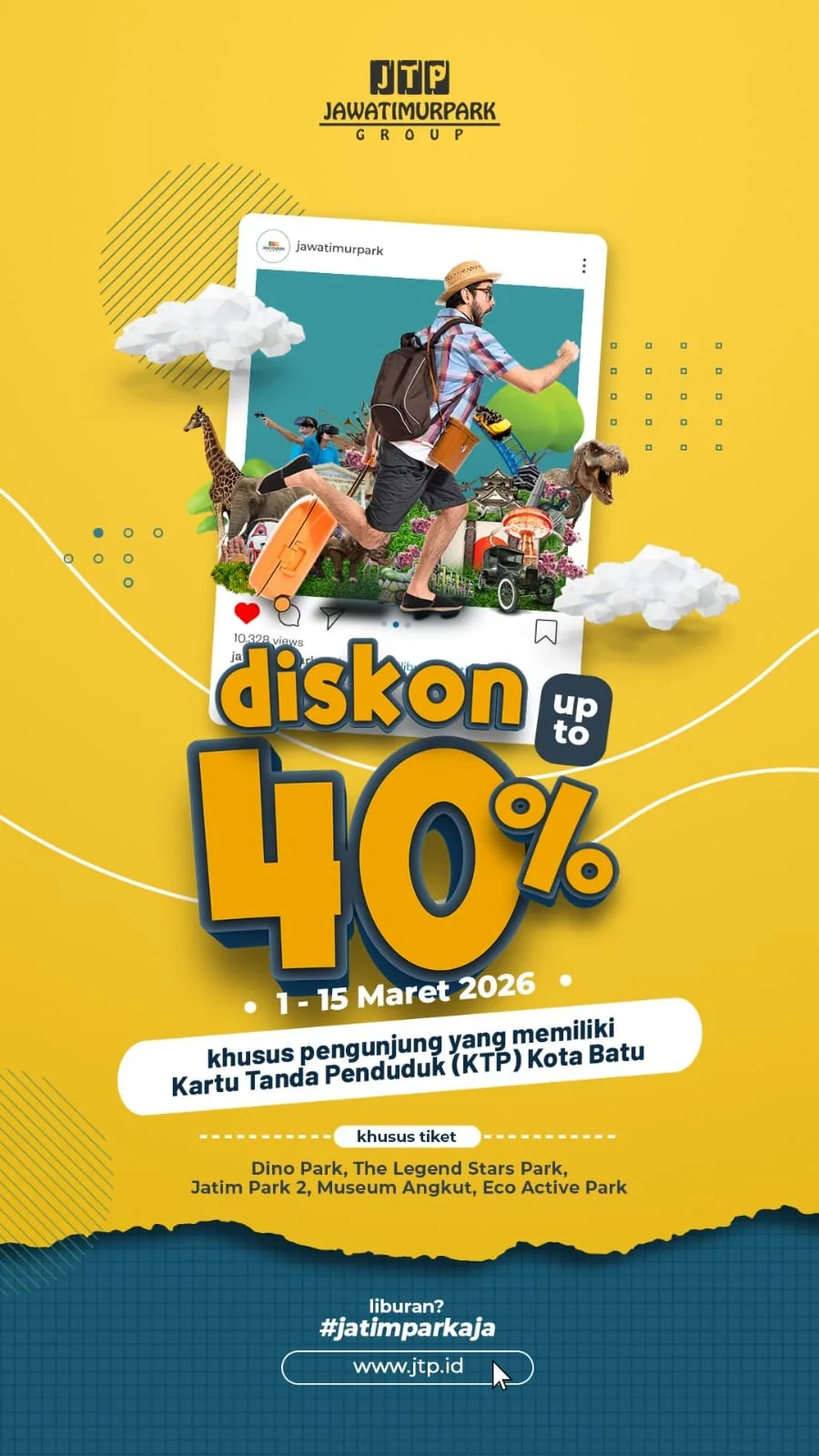 - Promo Umum (Diskon 20%) – Periode 15 Feb – 15 Maret 2026 Berlaku untuk pembelian online (jtp.id/OTA) di destinasi: Legend Stars, Batu Love Garden, Fun Tech Plaza, Museum Musik Dunia, Milenial Glow Garden, Eco Active Park, Drive Thru Park, dan Museum Tubuh.