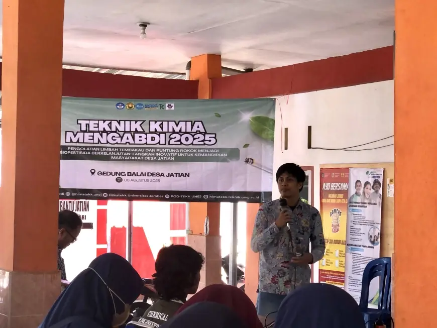 Mahasiswa Teknik Kimia UNEJ yang tergabung dalam tim Teknik Kimia Mengabdi (Tekkim Mengabdi) 2025 berupaya mengimplementasikan inovasinya kepada petani di Desa Jatian, Kecamatan Pakusari, Kabupaten Jember yang mayoritas petani tembakau. Selain memberikan pelatihan pembuatan biopestisida, mahasiswa Tekkim UNEJ juga akan melakukan pendampingan pada petani selama setahun.