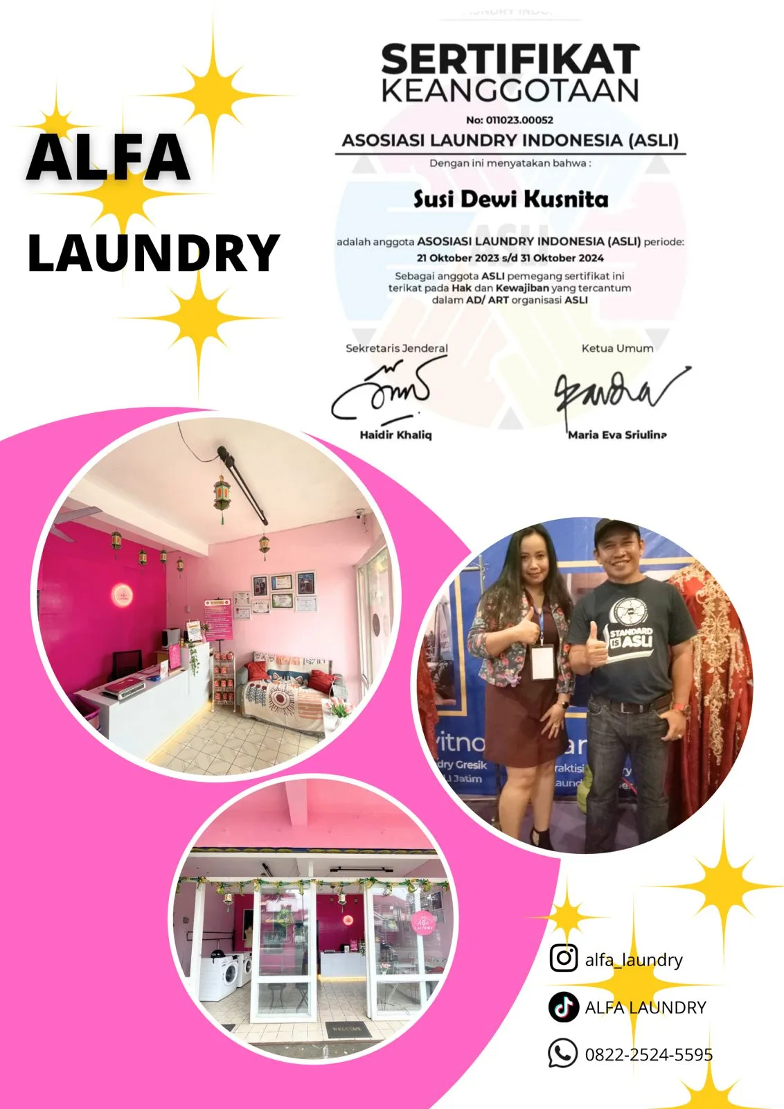 Keamanan pakaian pelanggan terjamin karena Alfa Laundry telah mengantongi Sertifikat Keanggotaan dari Asosiasi Laundry Indonesia (ASLI). Hal ini memastikan bahwa prosedur pencucian yang digunakan telah sesuai dengan standar operasional yang profesional dan aman bagi berbagai jenis bahan kain.