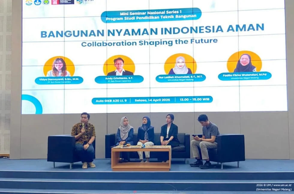 IDEA JATIM, MALANG – Program Studi Pendidikan Teknik Bangunan (PTB) Fakultas Teknik Universitas Negeri Malang (UM) sukses menggelar Mini Seminar Nasional Series 2 dengan menghadirkan praktisi industri kelas dunia untuk meningkatkan kompetensi mahasiswa di bidang konstruksi. Kegiatan bertajuk “Bangunan Nyaman, Indonesia Aman” yang berlangsung pada Senin (14/04) ini menjadi langkah strategis UM dalam memperkuat sinergi antara akademisi dan dunia kerja.