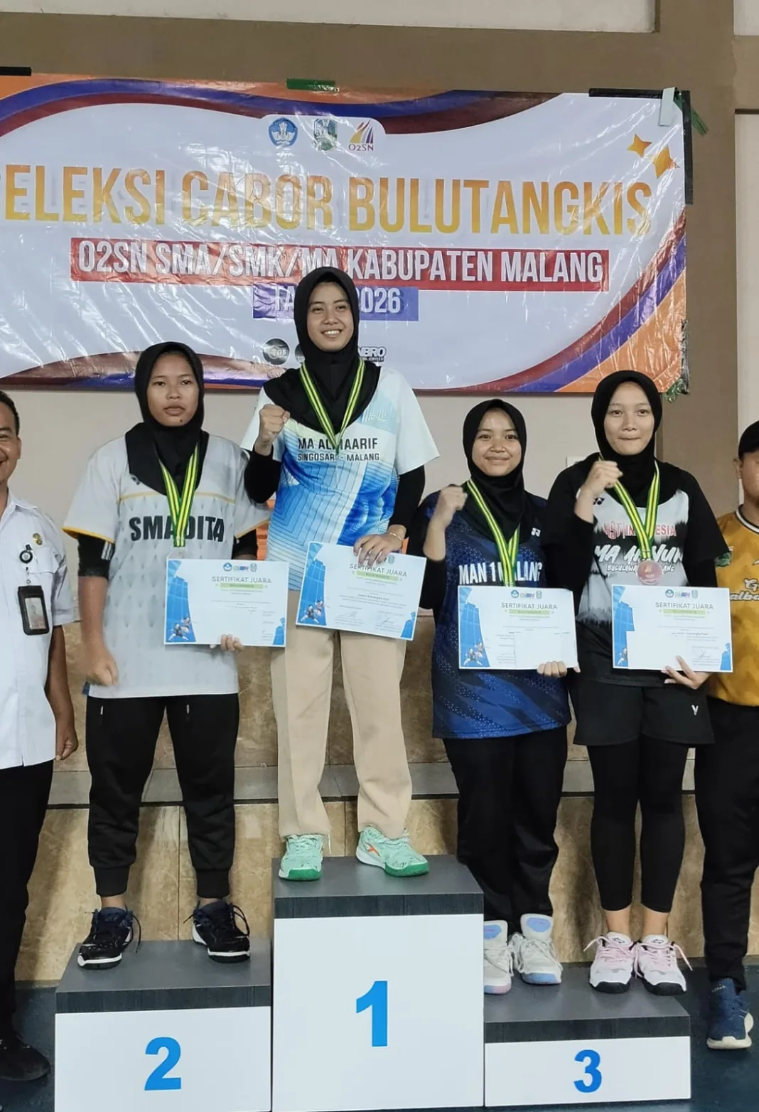 IDEAJATIM.ID, MALANG – Prestasi membanggakan kembali ditorehkan siswa MA Almaarif Singosari. Saskia Rahma Rojabi Sayuti, siswi kelas XI-3, berhasil meraih Juara 1 cabang olahraga badminton tunggal putri dalam ajang Olimpiade Olahraga Siswa Nasional (O2SN) tingkat kabupaten.
