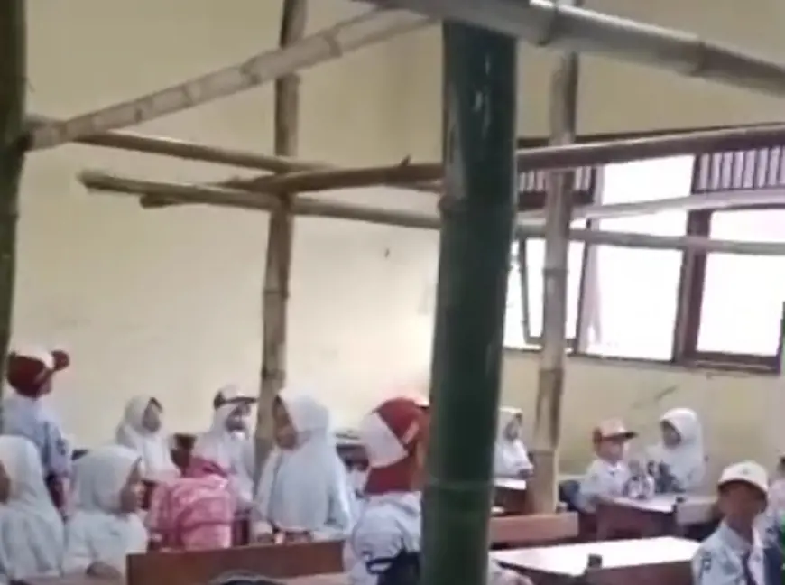 Kepala Sekolah SDN Karangpakis 2, Sutin mengatakan kondisi bangunan memang ditopang dengan kayu bambu. Bukan kondisi atap yang akan ambrol, tapi hanya bocor.